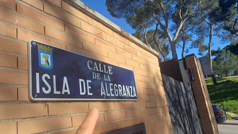 La placa dice "Calle de la Isla de Alegranza". Letras blancas sobre fondo azul oscuro, con el escudo del Ayuntamiento de Madrid en la esquina izquierda. Está atornillada a una fachada de ladrillo visto, en una calle residencial del noroeste de la capital. Quien la señala con la mano sabe lo que significa. Alegranza no es un concepto abstracto ni un nombre decorativo: es un islote como ya saben , de diez kilómetros cuadrados, el punto más septentrional del Archipiélago Canario, propiedad privada, deshabitado, perteneciente al municipio de Teguise, en Lanzarote. Y sin embargo, ahí está su nombre, a 1.700 kilómetros del Atlántico, entre bloques de pisos , paradas de guagua y el gran parque de La Dehesa de La Villa.